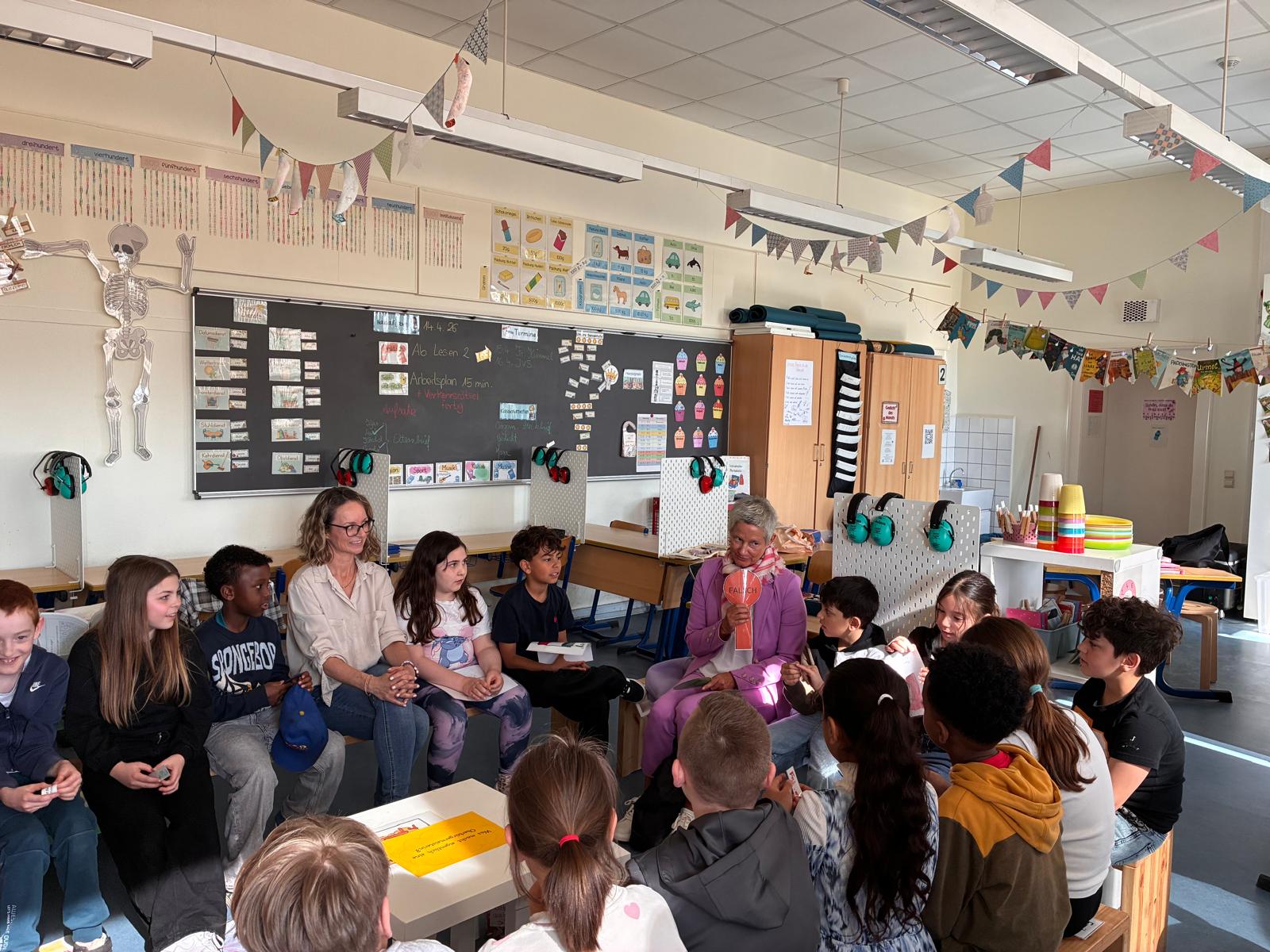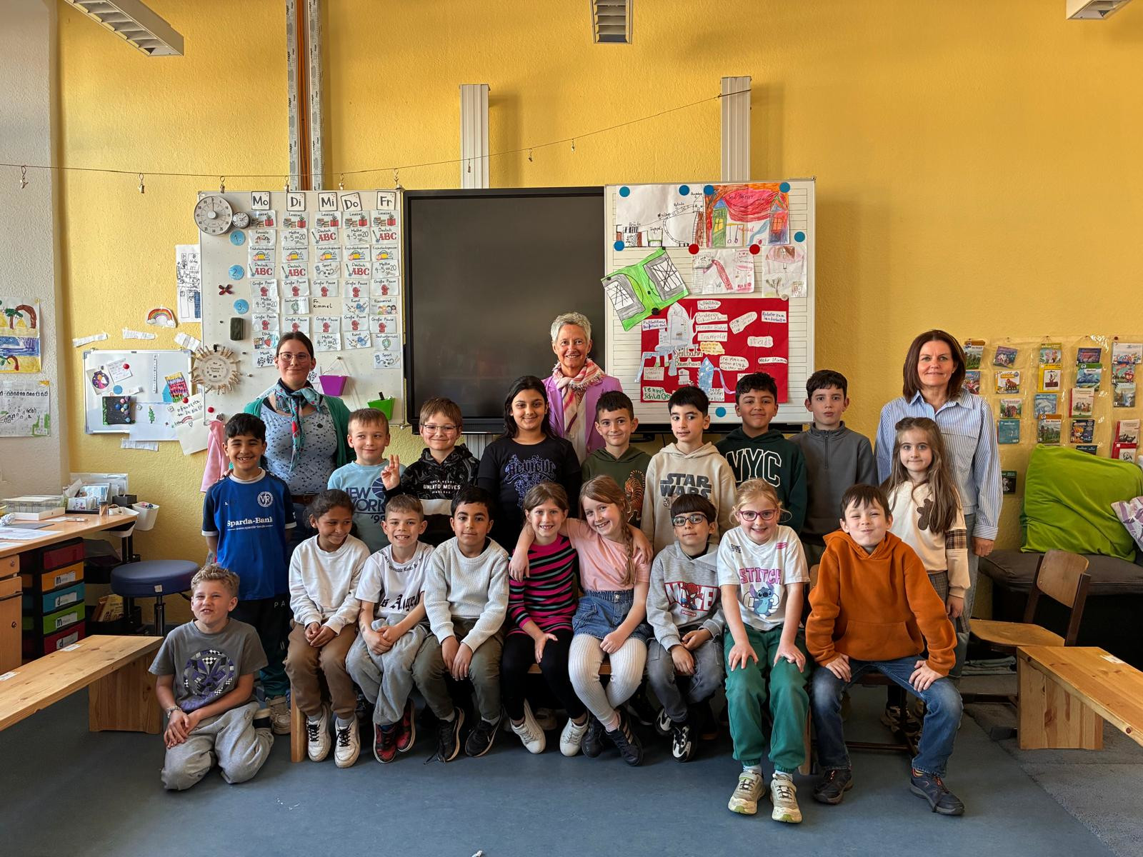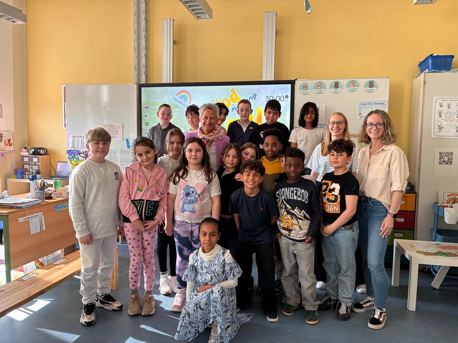 Oberbürgermeisterin Beate Kimmel freute sich sehr, zu Gast in der Schule zu sein, die sie als Kind selbst besucht hatte. Sie berichtete den wissbegierigen Kindern unter anderem, dass es in der Schule früher strenger zugegangen sei und auch die Klassenräume nicht mit selbst gebastelten Plakaten so schön gestaltet gewesen seien. Mit zwei Bildern gab sie den Kindern Einblick in Privates und Dienstliches. Ihre Haustiere, Hund und Katze, stießen auf große Begeisterung. Ein Bild von den regelmäßig vielen Arbeitsmappen auf ihrem Schreibtisch sorgte für staunende Gesichter.