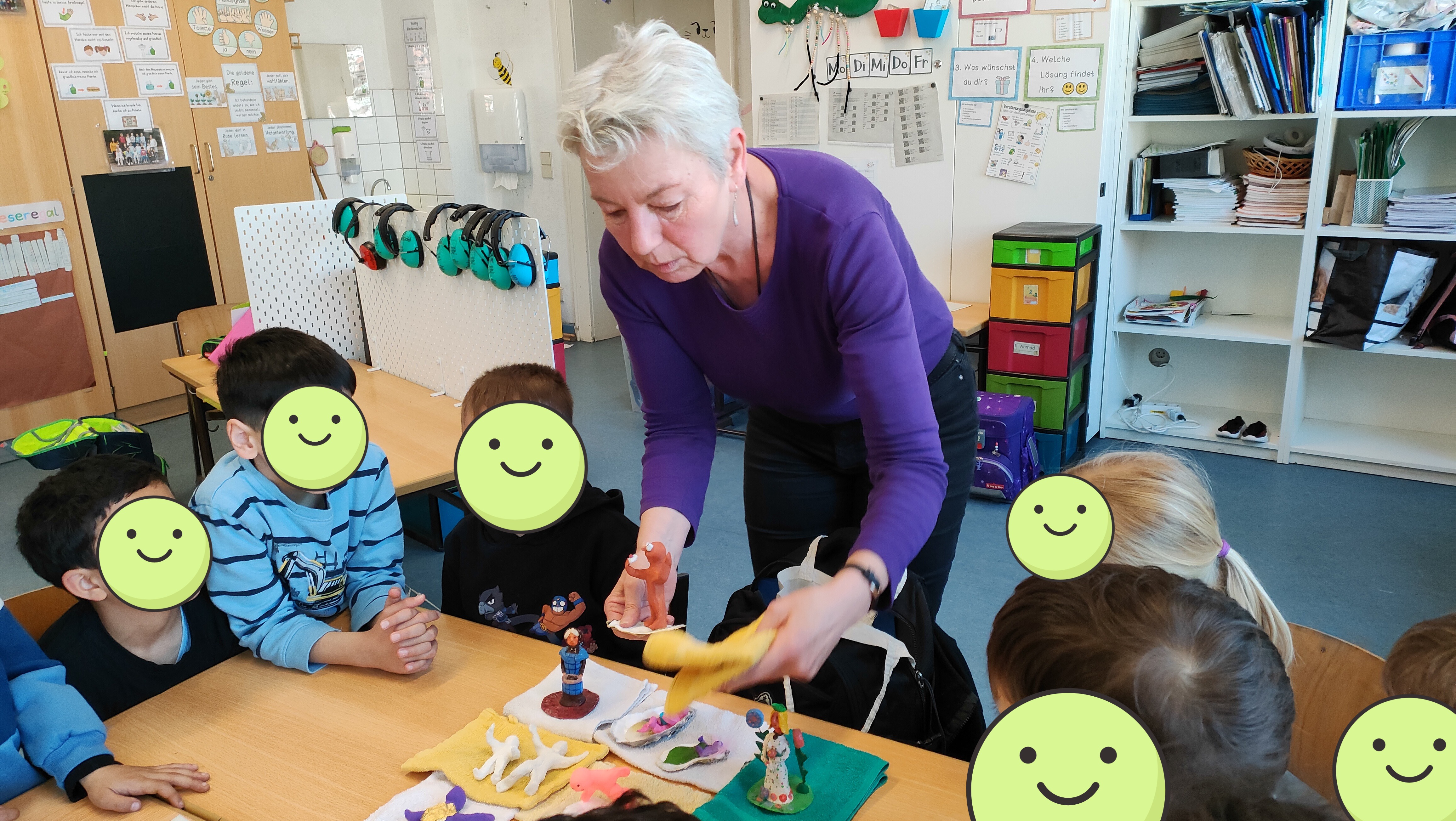 In diesem Schuljahr hat die Klasse 2c das Glück, an einem von der Stadt und dem Bildungsbüro organisierten Kunstprojekt mit der Künstlerin Karin Reiche teilnehmen zu dürfen. In 10 Stunden werden die Kinder sich selbst und einen Hintergrund modellieren. Da das Projekt unter dem Nachhaltigkeitsaspekt stattfindet, werden bereits vorhandene oder gefundene Dinge benutzt, um sich selbst in Szene zu setzen.